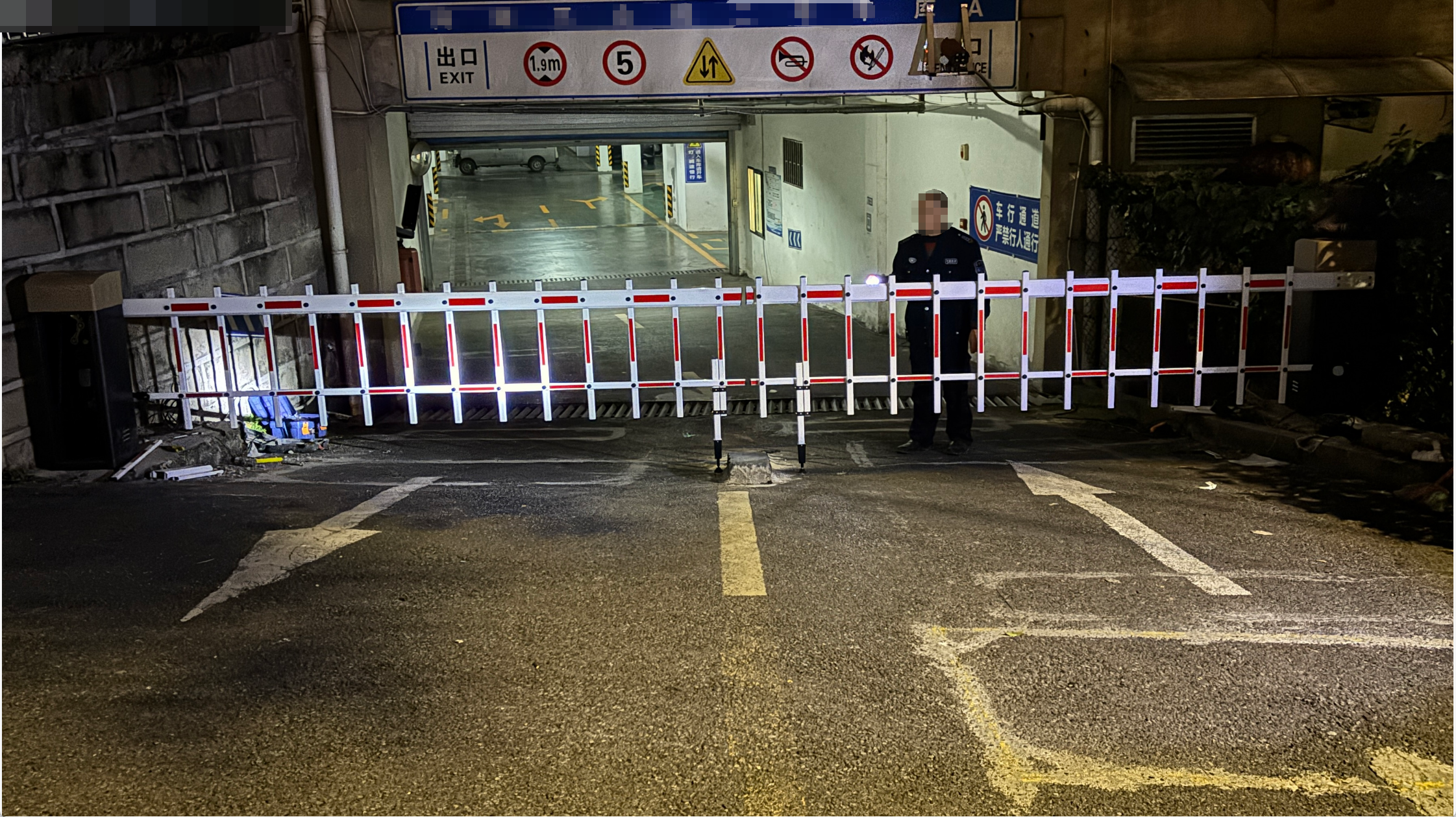如图一所示:地下车库出口在夜间状态下,道闸展开后对出口形成有效隔离,安全性明显提升。